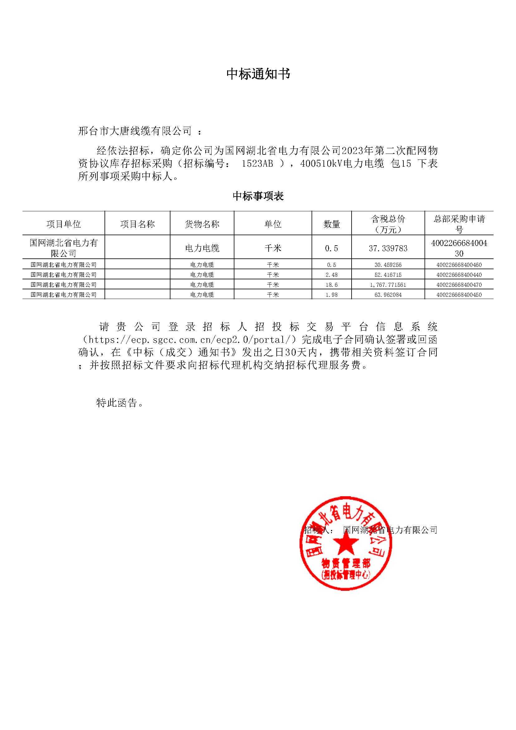 祝賀我公司于2023年在國網(wǎng)湖北省電力公司2023年第二次配網(wǎng)物資協(xié)議庫存招標(biāo)采購項目中成為中標(biāo)廠家。中標(biāo)金額1951.94萬元。感謝國網(wǎng)湖北省電力公司一直以來對我公司的支持及認(rèn)可,我公司會以過硬的產(chǎn)品品質(zhì)和良好的服務(wù)態(tài)度,服務(wù)國家電力建設(shè)!