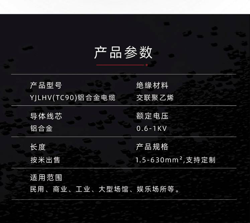YJHLV鋁合金進(jìn)行電纜,別稱TC90(-40)、YJXLHV、YJHLV、YJGLHV、YJGLHBV等。是以鋁合金材料為導(dǎo)體,采用特殊緊壓工藝和退火處理等先進(jìn)技術(shù)發(fā)明創(chuàng)造的新型材料電力電纜。